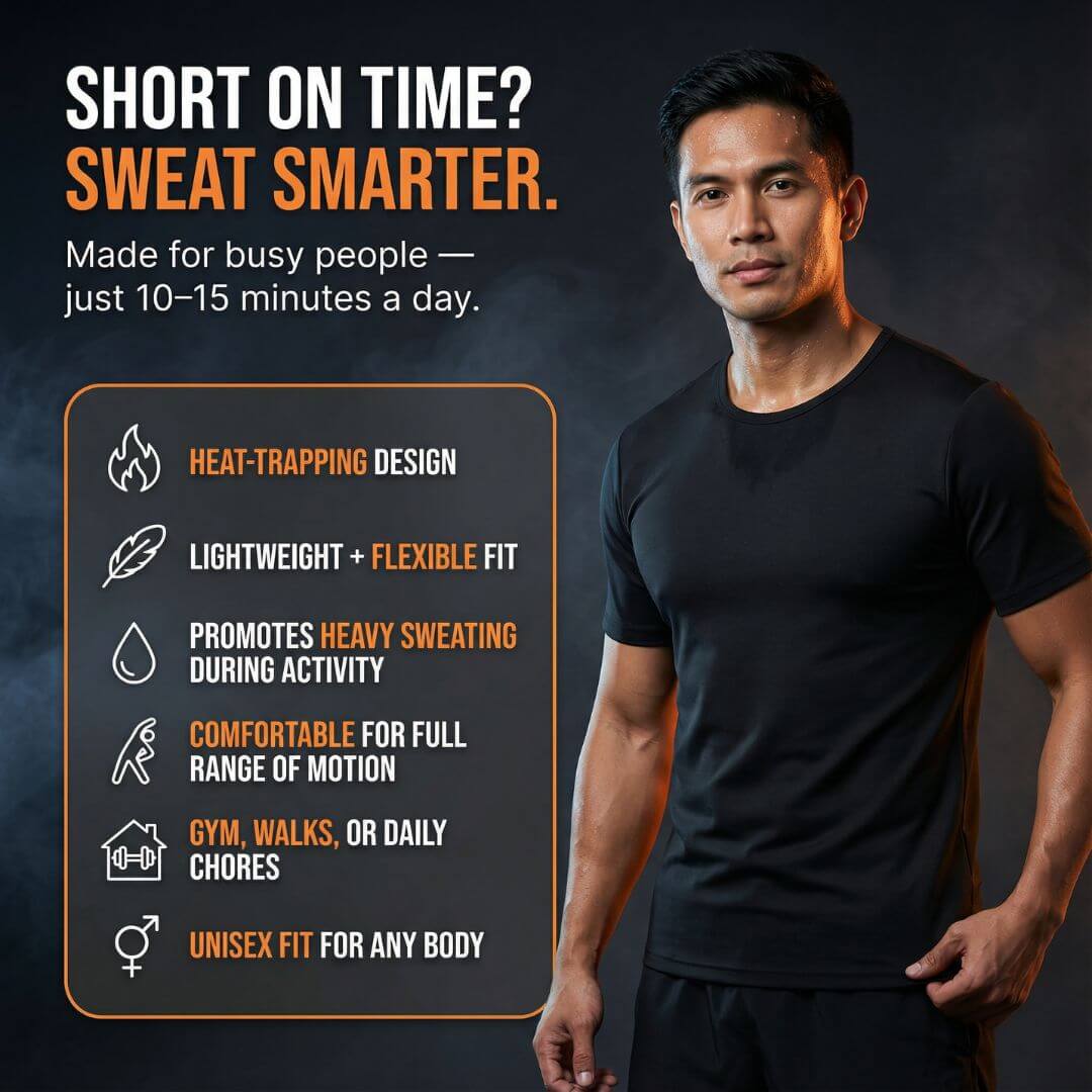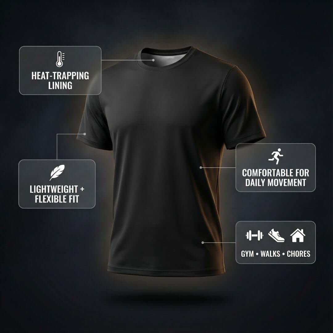 It’s designed with heat-trapping layers that raise your body temperature as you move. This creates a sauna-like effect that boosts sweat, enhances circulation, and helps burn more calories — even during light activity.